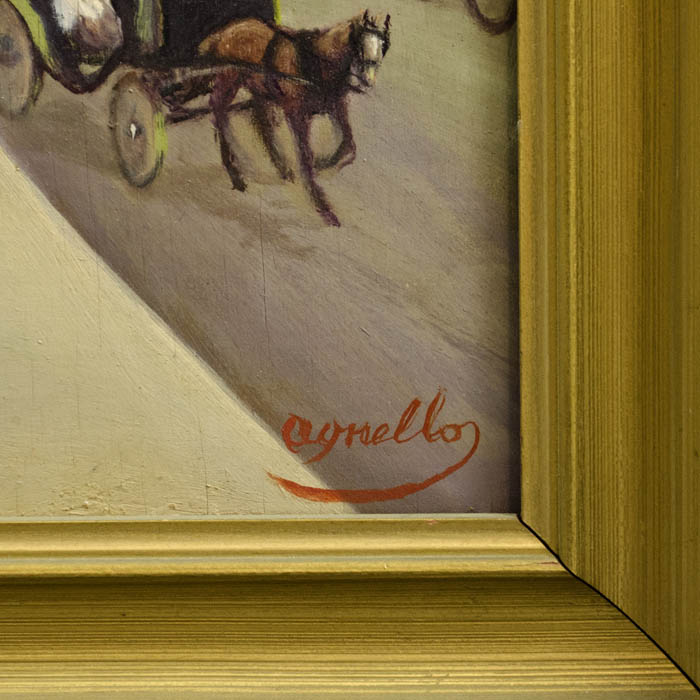 John Agnello was an American painter in oils and fresco. Born in Italy, he was self taught and traveled the world as a young man before settling in New York City by the time he was 30 years old. Beginning in 1932, he participated in the annual Washington Square Outdoor Art Show and the exhibits of Society of Independent Artists. He painted murals for both private homes and churches, and also did portraits. An allegorical portrait he painted in memory of President John F. Kennedy was exhibited in the New England pavilion of the New York World’s Fair in 1964, and was subsequently donated to the John F. Kennedy Memorial Library. He is particularly well known for his urban genre scenes in which he liked to include people to convey the activity of the subject city as well as its buildings and various landmarks. These were done in various locales, including New York City, where his studio was, as well as in Europe where he traveled.