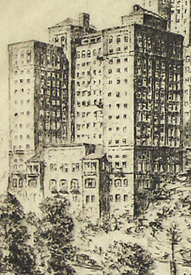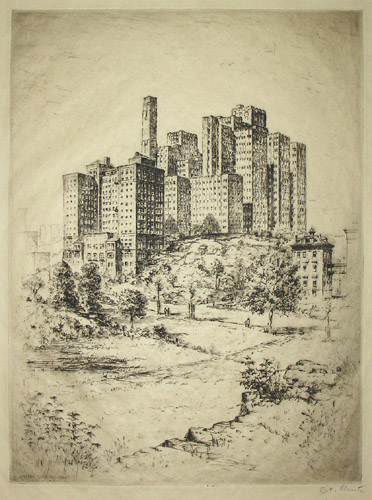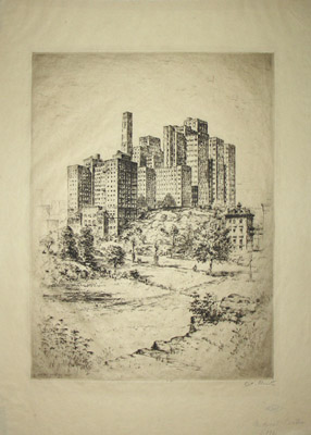 Anton Joseph Friedrich Schutz was an etcher, writer, and editor, born in Germany. He studied at the University of Munich and the Royal Bavarian Academy of Fine Arts. By 1925 he relocated to New York City, where he studied at the Art Students League. He created an extensive series of etchings of New York City scenes during the 1920s and 30s, 24 of which were published in his book New York Etchings (1939). Schutz was a member of the Society of American Etchers and the Chicago Society of Etchers. During his lifetime his works were exhibited and collected by major institutions in the U.S. and abroad, including the Library of Congress, the British Museum in London, the Bibliothèque Nationale in Paris, the New York Public Library, the Art Institute of Chicago and the Uffizi Gallery in Florence. Schutz also contributed etchings to the 14th edition of the Encyclopaedia Britannica, served as director of the New York Graphic Society, authored Fine Art Reproductions of Old and Modern Masters (1951) and served as publisher and co-editor of 16 volumes in the UNESCO World Art Series, each on the art of a different country (1954-58). The New York Historical Society has 121 etchings of New York City scenes by Anton Schutz, including two of the Medical Center dated 1927, as part of the James Boyd Collection of New York City Etchings.