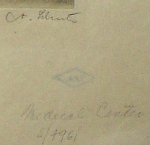 Condition: Generally very good, full margins, with only light overall toning and wear. Titled “Medical Center” in pencil in another hand lower right with pencil letters and numbers underneath title “S/496.” Diamond-shaped collector’s stamp in purple ink verso with initials FPS, lower margin, slightly bleeding through to front, can be matted out. Some tape residue top margin verso from former mountings, appears stable.