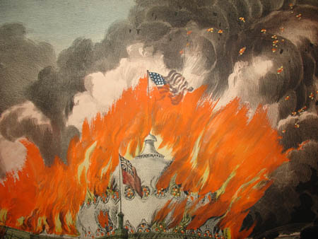 Dramatic colorful Currier & Ives folio lithograph showing the burning of the New York City Crystal Palace exhibition hall in 1858. Prints documenting dramatic news events and disasters were popular in 19th century America; Currier & Ives alone produced 17 prints with titles beginning “Burning of” and two depictions of the Crystal Palace fire, the large one shown here and a small version with a similar composition. This print is in a 19th century, probably original, walnut frame.