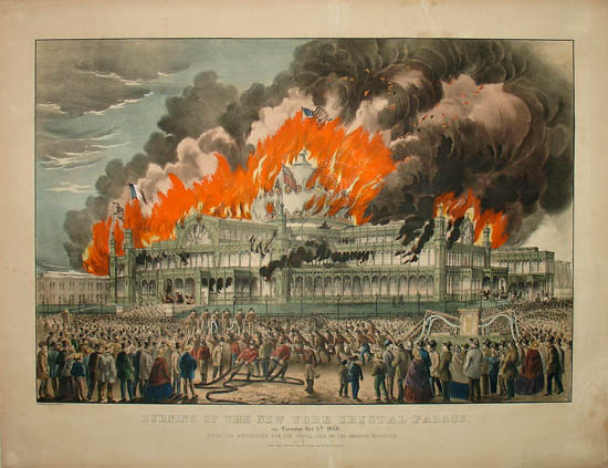 The New York Crystal Palace was constructed almost entirely of iron and glass for the 1853 New York Exhibition, the first World’s Fair held in the United States. Designed to be a worthy counterpart to the Crystal Palace in London, it was the focus of national pride, a sparkling landmark with an immense 100-foot dome. President Franklin Pierce presided over the opening ceremonies. After the World’s Fair, it was utilized by other organizations. At the time of the fire, it housed the 30th Annual Exhibition of the American Institute: exhibits of fine and decorative arts, jewelry, gems, models of machinery and inventions. When it suddenly went up in flames, the New York Times reported: “The calamity has struck every one aghast, for the possibility of such an event has never been calculated upon. … The great fabric of glass and iron, with its priceless treasures of art, were suddenly wiped out of existence as though they had been mere unsubstantial vapor.” Aided by high winds and the failure of the extinguishing apparatus, the fire spread with astonishing rapidity: the Times account states that within 15 minutes the dome came crashing down. Remarkably, although about 2,000 people were in the Crystal Palace when the fire broke out, no one died in the fire. However, the building and its contents were thoroughly destroyed; the Times estimated the value of the lost exhibits to be at least half a million dollars.