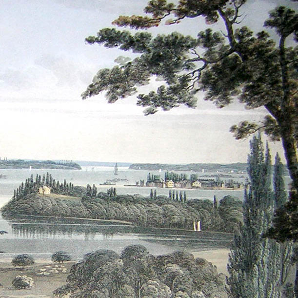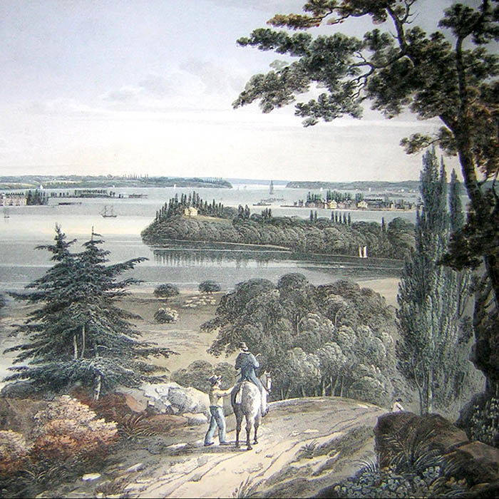 The steeple at the right end of Manhattan Island is Trinity Church; at the extreme left is Saint John’s Chapel. Connected to the tip of the island by a bridge is Castle Clinton (later Castle Garden). Governor’s Island, with Castle Williams, lies just off Manhattan. In the right middle ground is Stevens Point. On July 12th of the year this view was made, the New York Evening Post suggested that Castle Clinton be converted into public baths: “It would yield a greater revenue to the city than any other plan that has been proposed respecting it. Bathing might easily be rendered a fashionable as well as a healthy amusement.”