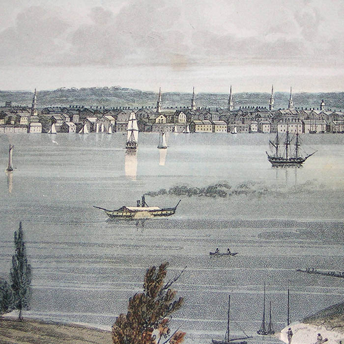 William Guy Wall has given us matching views of New York much in the manner of two sides of the same coin. Here we view the city from the Jersey side, looking across the Hudson River. In the complementary view, entitled New York from Heights near Brooklyn… we are invited to an aspect from across the East River.