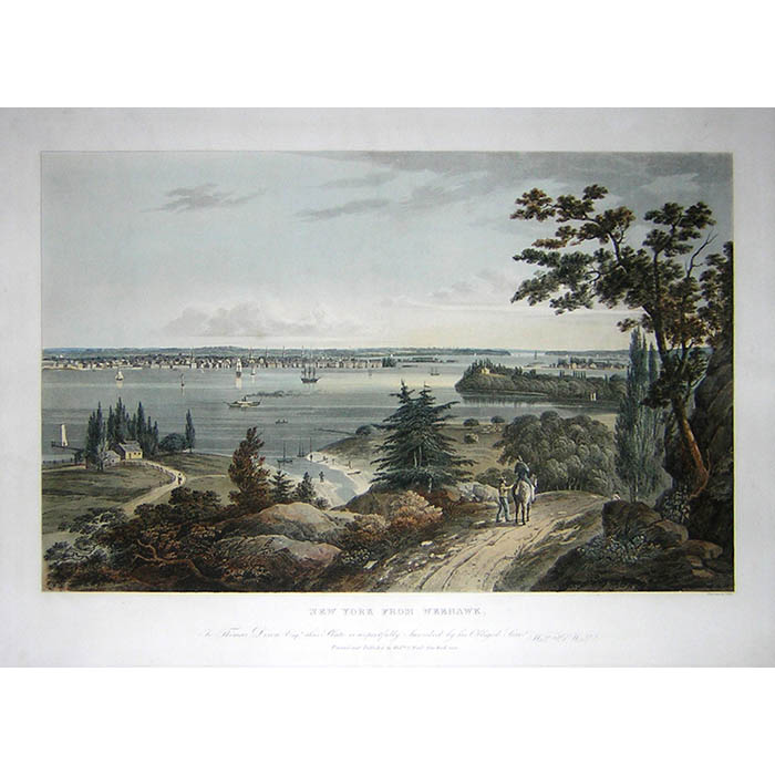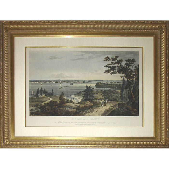 William Guy Wall was a watercolorist and landscape painter, and print publisher. Born and trained in art in Ireland, he emigrated to New York City in 1818, where he spent the next 10 years. There he won wide recognition for his views of the City and the Hudson River. In addition to New York From Weehawk and the companion view New York from Heights near Brooklyn, he painted a set of twenty views, from New York City to successive vantage points along the Hudson River, engraved by John Hill and published in the Hudson River Portfolio (1821-1825). A founding member of the National Academy, he exhibited there and at the Pennsylvania Academy. He continued painting and exhibiting his work over the next several decades relocating several times between New England, New York State and Dublin, Ireland. Several of his original watercolors are in the collection of the New York Historical Society as well as the Metropolitan Museum of Art.