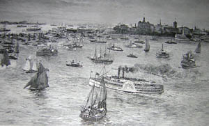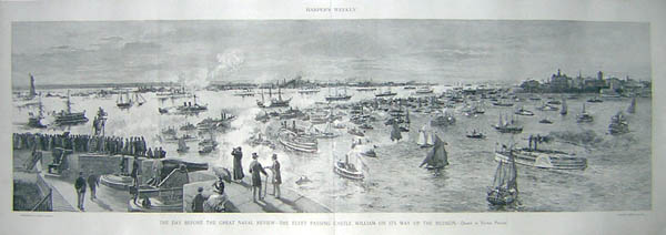 The Great Naval Review took place in conjunction with the 1893 Columbian Exposition, a U.S. World’s Fair in honor of Columbus that took place in Chicago. In 1890, Congress passed an act authorizing the president to hold a naval review in New York harbor in late April 1893 “and to extend to foreign nations an invitation to send ships of war to join the U.S. Navy in rendezvous at Hampton Roads (Virginia) and proceed thence to said review.” Britain, France, Russia, Spain, Holland, Italy, Germany, Brazil and Argentina also participated, with a total of 35 vessels. Spain sent three replica caravels of Columbus’s ships, the Nina, the Pinta and the Santa Maria. President Grover Cleveland attended the event.