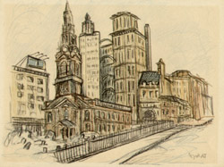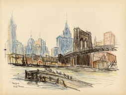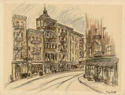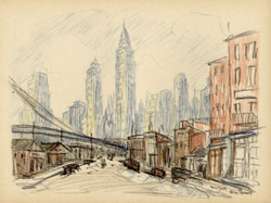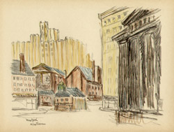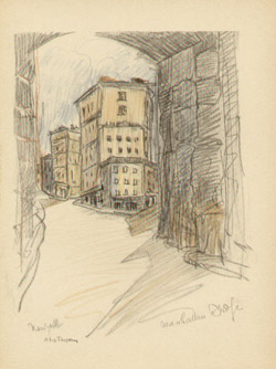 Alice Thévin was born near Paris, France, and spent her childhood first in Paris and then in Le Havre, where she attended the convent of Sacre Coeur. After earning her degree, she returned to Paris where her circle of friends included artists and writers. She came to the United States with American friends she had met in Paris. For several years she lectured on art and literature in Boston, Philadelphia and New York. Falling ill, she returned to France to recuperate. After recovering, she realized her long cherished ambition to become a painter. She preferred plein air painting in oils and watercolors, interpreting the Swiss and French countryside, villages and street scenes. Wherever she traveled, she looked for interesting subjects and would delve into the history and background information of her subject. As she grew older, Thévin divided her time between Europe and the U.S. America’s freewheeling atmosphere appealed to her restless, modern spirit and stirred her imagination: the pastoral old farm houses, barns and bridges of New Hampshire and Vermont, and the bustling, energetic metropolis of New York, where she enjoyed ferreting out the less obvious subjects: a forgotten church, a crooked street, a quaint corner, a tiny square, waterfront docks or a dilapidated tenement building. She exhibited her work in Paris, New York and Boston, though the act of painting was more important to her than an exhibition career. At her death she left behind many portfolios filled with sketches of Paris and New York.
