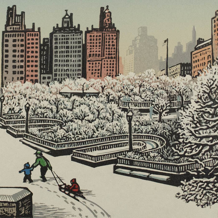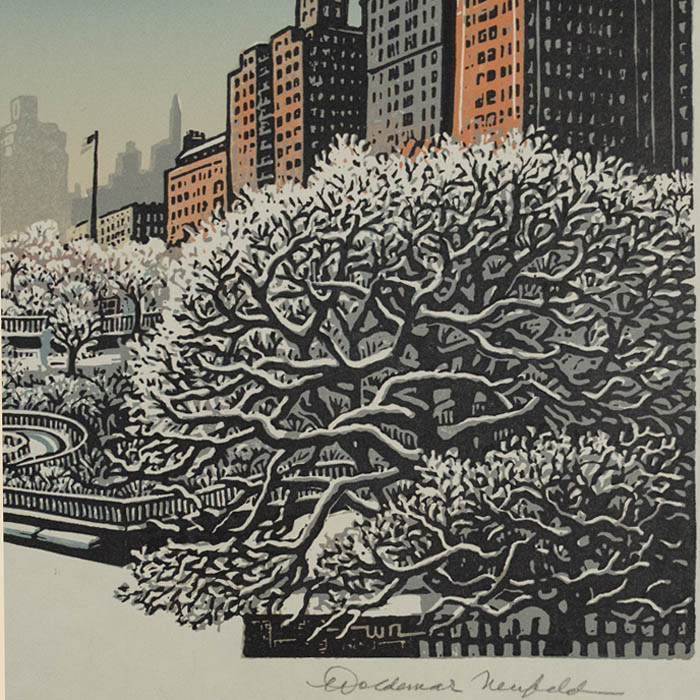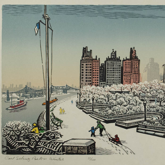 In 1945, Neufeld moved from Cleveland to the Upper East Side of New York City, where he became known as the “artist laureate of the East River,” recording his impressions of the waterfront neighborhoods in oils, watercolor and block prints. He served as art director of the East River Artists from 1948 to 1975. In 1976, his works were shown in New York City at the South Street Seaport Museum in an exhibit titled “Yesterday’s Lower Manhattan.”