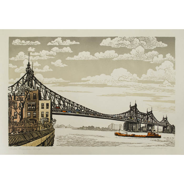 In 1945, Neufeld moved from Cleveland to the Upper East Side of New York City, where he became known as the “artist laureate of the East River,” recording his impressions of the waterfront neighborhoods in oils, watercolor and block prints. He served as art director of the East River Artists from 1948 to 1975. In 1976, his works were shown in New York City at the South Street Seaport Museum in an exhibit titled “Yesterday’s Lower Manhattan.”