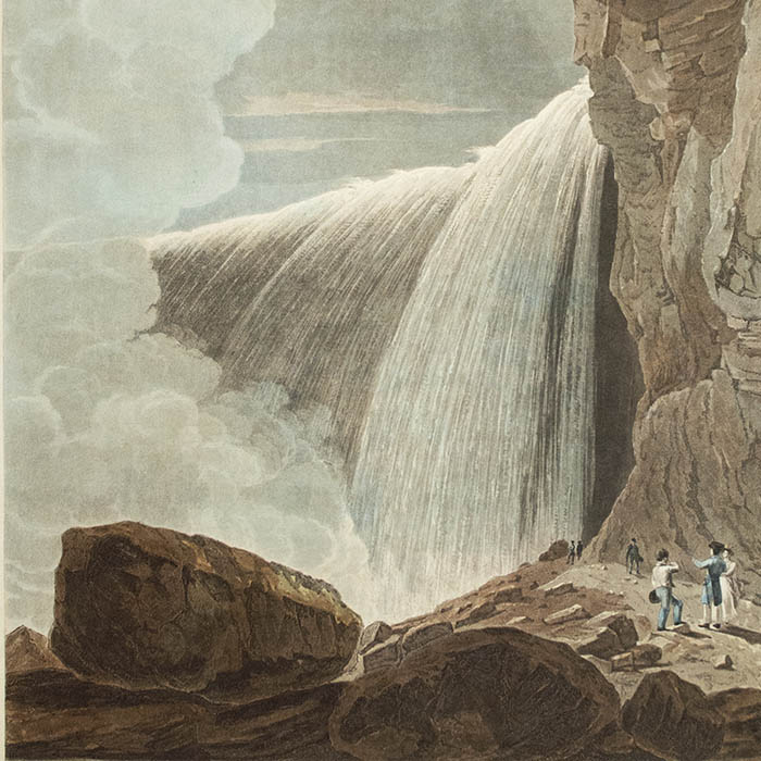 “William Bennett’s depiction of Niagara Falls from under the towering Table Rock is even more dramatic than his companion view from Prospect Point [Item 363]. The splendor of the primeval wilderness that most Europeans associated with the virgin land of America is here forcibly communicated at a range close enough to inspire awe in the viewer. Though figures are included in the scene to project a sense of scale, the pronounced focus is on the ever-changing, nonfigural drama of nature’s primal elements: water, air, sky, clouds, and rocks. Each is presented with an overwhelming power of its own, unified in a radiant composition that underscores the mysterious harmony of the natural world.