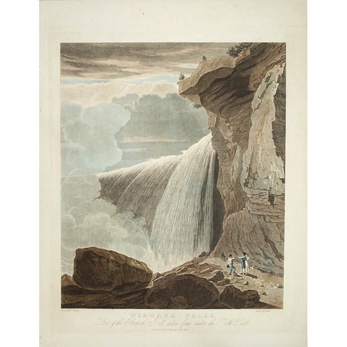 Bennett’s original rendering for the aquatint was in the medium of watercolor. He exhibited it at the National Academy of Design in 1829 (the year that marked his full membership in the academy) along with three other of his creations: a view of New York and two landscapes near the Bay of Naples . The Italian views, made abroad while Bennett was still a resident of his native England, came to America with the artist in 1826. Bennett’s application to exhibit the Niagara view is accompanied by the notation that is “One of a series of Views of the Falls, Publishing by H. I. Megarey, Esq.” Bennett made a double set of views of Niagara, which were rendered in aquatint. The dates for the first set were established by Richard J. Koke, whose Checklist provides interesting details regarding the execution of the two aquatints. The aquatints for the second set were issued in 1830. All were published under the imprint of Henry Megarey.”