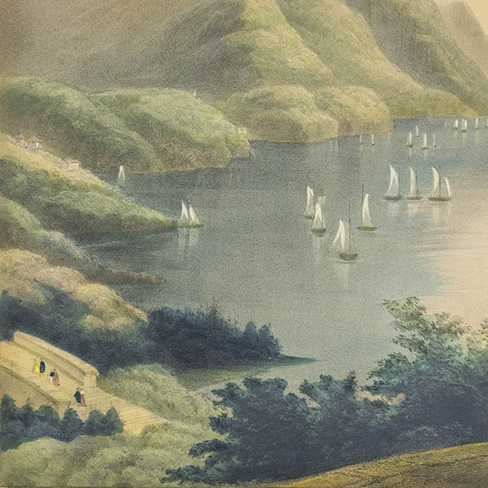 Picturesque views of the Hudson River became popular subjects for artists at the turn of the 19th century, and West Point was a favored vantage point with its dramatic scenery of the river flanked by mountains on either side. The print is from a similar vantage point to the small engraved illustration of the “View from West Point” that appears in New York State Illustrated, or, The Tourist’s Guide Through the Empire State (1872); like the print it was published by Colt Publishing Co. The book illustration, however, shows a platform with cannons in the foreground, rather than the group of two women and a man in top hat and tails in this version. This print is apparently extremely rare; we were unable to find any other examples, or indeed any other separately issued prints published by the Colt Publishing Co.