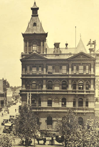 The National Bank Building featured in the center of the photograph was designed by Leck and Emley and built in 1903-04. It is now the First National Bank at 80 Albertina Sisalu Road, near the Johannesburg City Hall and City Library. A street view on Google Maps shows that the buildings to the left in the vintage photograph, that then housed the Royal Exchange Assurance building and the City Business College, were demolished and replaced by an addition to the National Bank building in the same architectural style. The demilune windows shown in the upper story were also replaced by rectangular ones.
